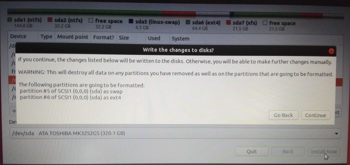 • Si hemos creado la partición swap previamente con Gparted, el instalador no marca la selección de la partición swap (ver las imágenes abajo). Lo que quiero decir es que el instalador no es claro (al momento de la selección de las particiones) en indicar que hemos seleccionado una partición swap para la instalación. Sin embargo, luego de hacer click en «Install Now», una ventana de warning se abre e indica las particiones que hemos elegido para la instalación del SO. Ahí sí podemos corroborar con claridad las particiones que han sido configuradas para la instalación de Ubuntu.