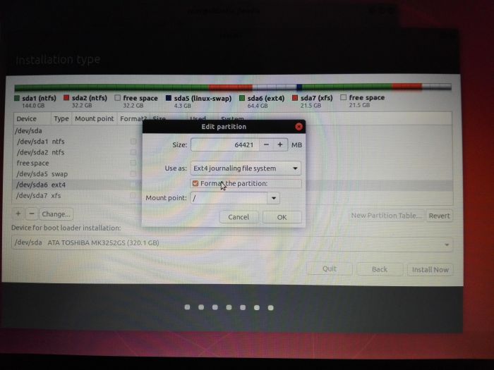 • Cuando elegimos la partición en donde será instalado Ubuntu y tenemos, por supuesto, que asignarle un «Mount point», el instalador no da la opción de asignar el «Moint point» hasta que seleccionemos «Format the partition» e indiquemos, por supuesto, el «File System». Por tamto, así le hayamos dado un formato a la partición antes de iniciar el intalador de Ubuntu (a través de Gparted), tendremos que realizar el formateo de la partición en cuestión durante el proceso de instalación.